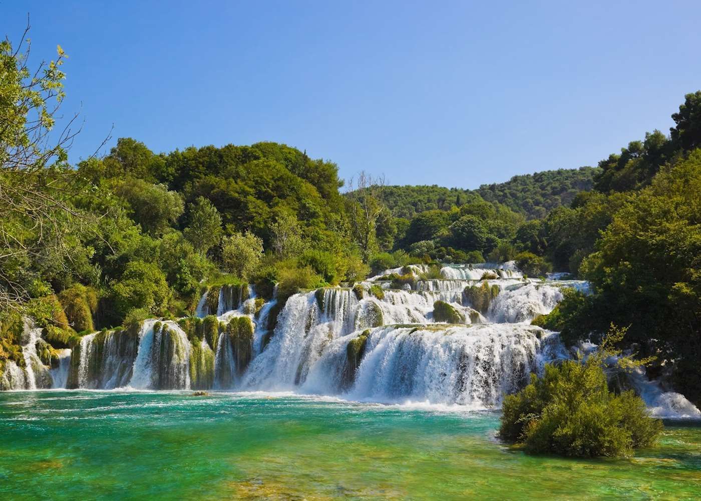 Attraktion des Nationalparks sind die sieben Wasserfälle. Die größten und schönsten Wasserfälle sind der Skradinski buk und Roški slap. Entlang der Krka und der Seen findet man viele alte Festungsruinen, Mühlen und einige Klöster. Hervorzuheben ist das Franziskanerkloster auf der Insel Visovac. Der Nationalpark Krka wurde 1955 gegründet. Bereits 1948 wurde das Gebiet des Parks als seltenes Naturgut und bedeutendes Gebiet eingestuft. Zwischen 1985 und 1997 wurde die Fläche des Nationalparks auf insgesamt 109 km² erweitert.
